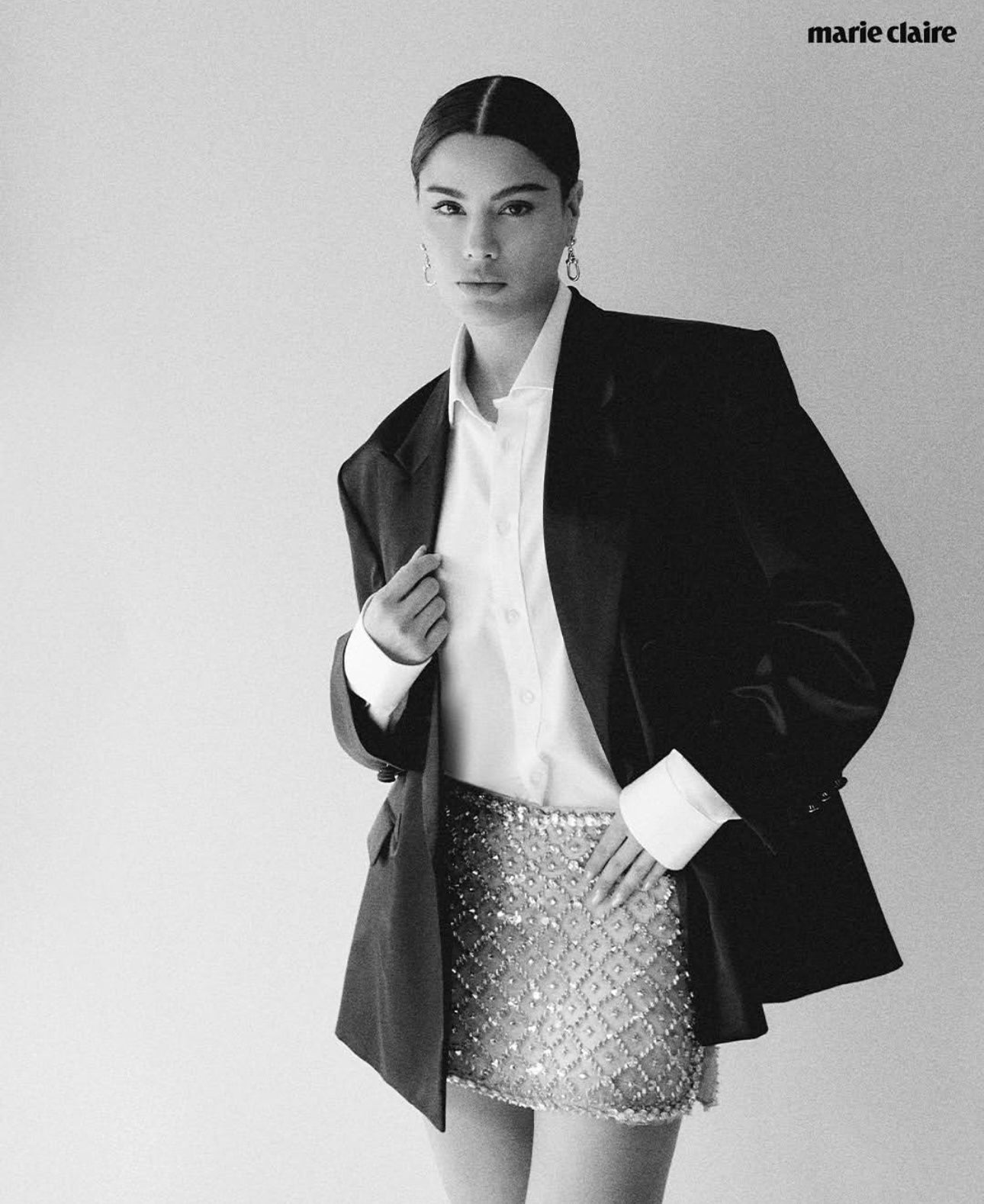 This blazer features handcrafted finishes and a refined design where the contrasting lapel adds the perfect touch of simplicity and elegance. Its oversized silhouette, buttoned cuffs, pointed lapel made from organic Japanese fabric, and functional piped pockets create a polished, contemporary look suitable for elevated everyday styling or formal ensembles.